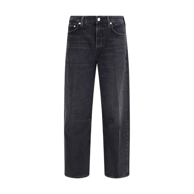 Miro high-waisted jeans with a slightly tapered barrel silhouette, made of black regenerated denim with a worn and marbling effect, an ankle length bottom for a versatile and contemporary style.