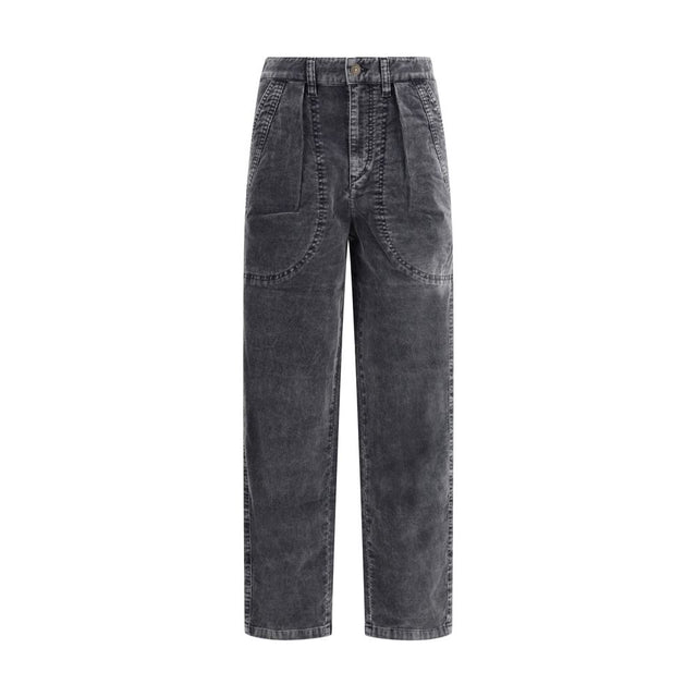 Marant Étoile’s ribbed velvet Pants are made of délavé velvet and are distinguished by their refined casual style. They feature a waistband with belt loops, a metal button and covered zipper closure, and delicate pleating at the front. Side pockets with rounded topstitching and patch pockets on the back add a functional touch. The design is completed by a leather label with embossed “Isabel Marant” logo on the back, a regular waist, and a wide, tapered cut.