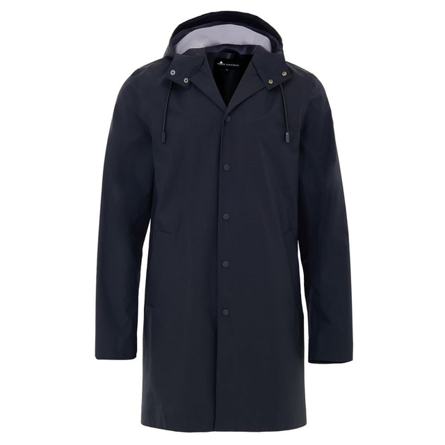 Moose Knuckles Waterproof Trench Coat in Black. Front fastening with covered buttons, two side pockets, classic shirt collar, and removable and adjustable hood. Composition: 74% Nylon, 26% Cotton