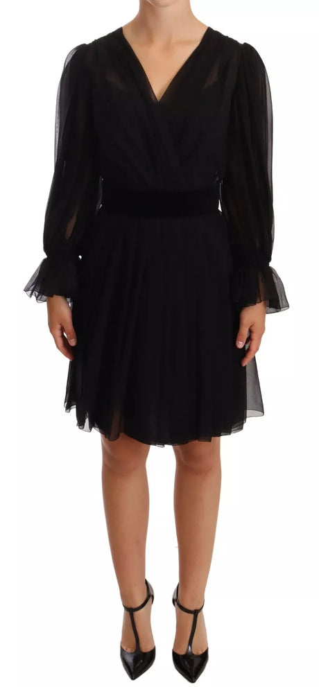 Dolce & Gabbana Sort Silke Tyl Langærmet Kjole med V-hals
