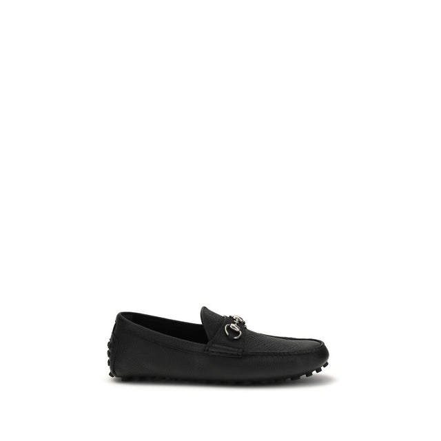 The Horsebit Driver Loafers by Gucci are crafted from black embossed leather and reflect timeless elegance. Silver-tone hardware and the iconic horsebit on the front add a distinctive touch, while the rubber sole with grommets ensures comfort and grip, making them ideal for refined everyday wear.
