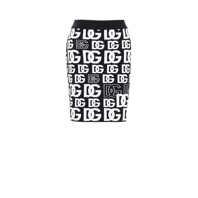 Black Jersey Miniskirt with Allover Dolce & Gabbana Print. Stretch fabric, black hem with contrasting DG print, black elastic waistband, and half-zip back closure.