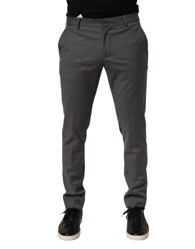 trousers are tailored from refined gray polyester, offering a smooth and polished finish. Designed as formal dress trousers, they feature a mid-rise waist and a classic cut, perfect for professional, evening, or elegant smart-casual styling.