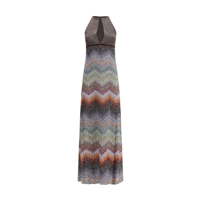 The long halter-neck Dress in Greek zigzag knit with sequins by Missoni embodies fluid elegance through its interplay of texture and light. Crafted from a viscose and lamé blend enriched with sequins, it features the distinctive Caperdoni loom workmanship that enhances the skirt with the iconic zigzag pattern. The sleeveless cut and halter neckline elongate the silhouette, creating a design that blends movement, sophistication and the unmistakable Missoni signature.