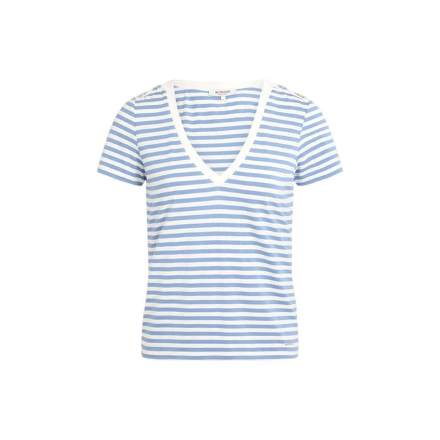 The Morgan De Toi 241-DINA women’s short-sleeve t-shirt features a timeless horizontal stripe pattern and a contrasting V-neckline for a touch of casual elegance. Crafted from a premium blend of 60% viscose, 32% polyester, 6% elastane/lycra, 1% metallic fiber, and 1% polyamide, this top ensures comfort, stretch, and a subtle sheen. The short sleeves and relaxed fit make it an ideal choice for spring and summer, perfect for everyday wear, leisure activities, or informal outings. Distinctive shoulder details add a unique and stylish finish, making this t-shirt a must-have for women seeking both practicality and refined style.
