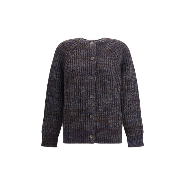 The brown Prada sweater features a crew neck, long sleeves, and button closure. Finished with ribbed hem and cuffs, it combines simplicity and comfort in a versatile piece suitable for various outfits.