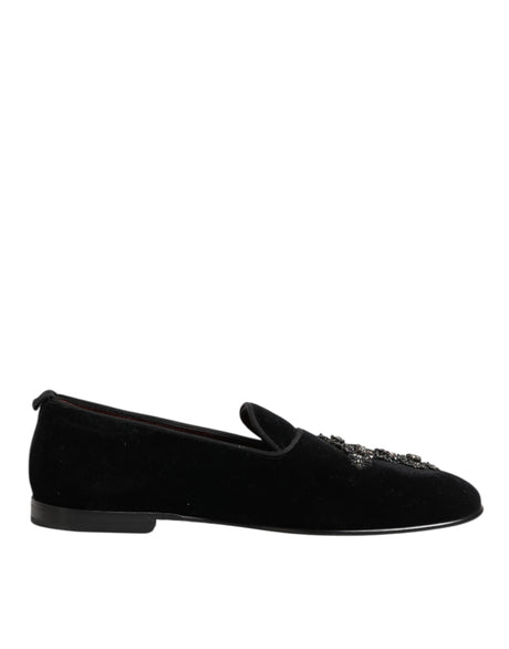 Dolce & Gabbana Black Velvet Embroidery Formal Loafers Shoes