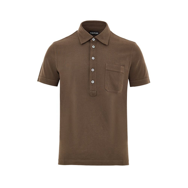 Tom Ford Brown Cotton Pique Polo Shirt. Button-front fastening, classic shirt collar, side patch pocket, short sleeves, and side vents.