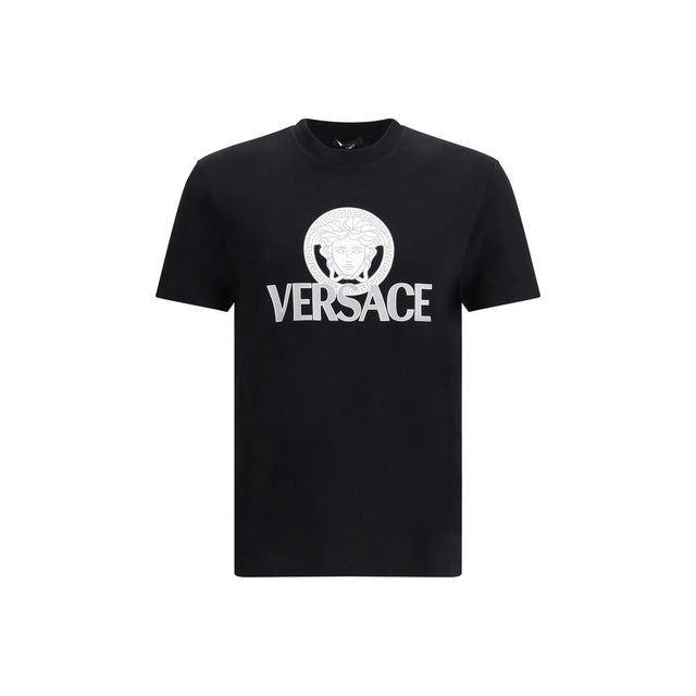 Versaces bomulds-T-shirt har en ribbet rund hals, der giver en behagelig og raffineret pasform. Maxiprintet med det ikoniske logo og kontrasterende monogram på forsiden tilføjer et karakteristisk og dristigt touch, der udtrykker mærkets luksuriøse og genkendelige præg.