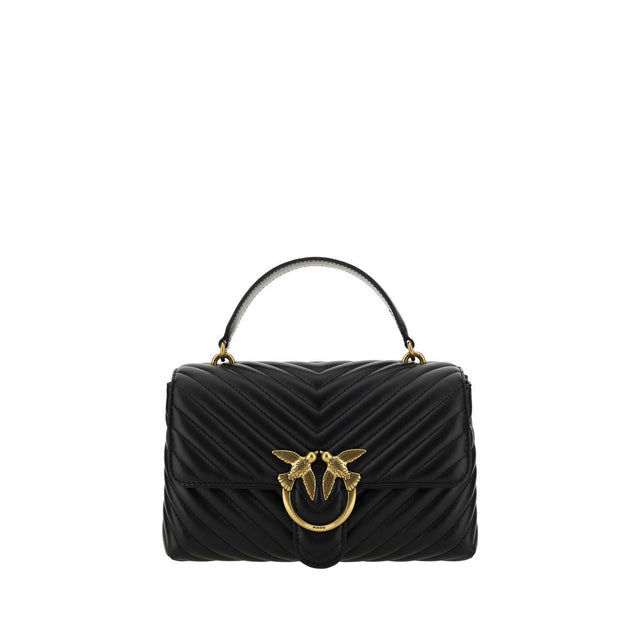 Calfskin Love Lady Handbag by Pinko, front magnetic button closure, iconic gold-plated and embossed Love Birds logo on front, quilted and padded design, double interior compartment, sliding chain shoulder strap, flat rigid handle at top, interior flat pocket with zipper, iconic tone-on-tone embroidered brand monogram on back.