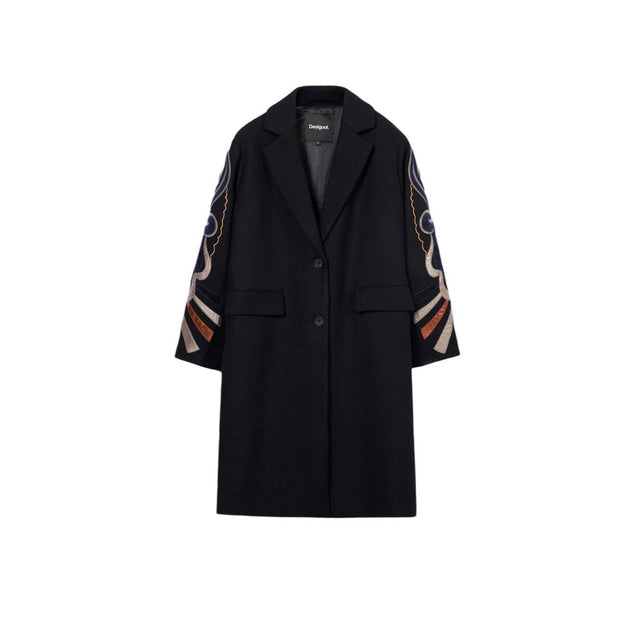 The Desigual COAT_CRACOVIA 24WWEWBA coat is the perfect choice for those seeking both elegance and originality during the colder months. Crafted from a premium blend of 55% polyester, 39% wool, 2% polyamide, 2% cotton, and 2% acrylic, this coat ensures warmth, comfort, and durability. The oversized fit with slightly dropped shoulders enhances the silhouette, while the sleeves are adorned with artistic embroidery, adding a distinctive and contemporary touch. Featuring a straight cut, two-button closure, and spacious front pockets, this coat is practical and versatile, ideal for both casual and formal occasions. A must-have for autumn and winter by Desigual.