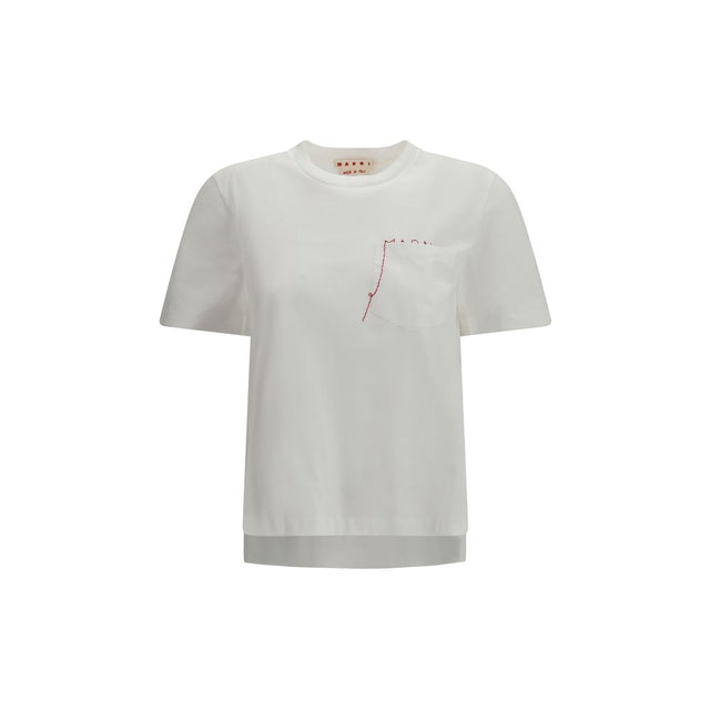The embroidered logo T-shirt by Marni is a casual-chic piece that plays with details for a unique look. The ribbed crew neck and asymmetrical hem give it a modern and original shape, while the front patch pocket, with the logo embroidered in red above the pocket, adds a distinctive touch. The cotton poplin back creates an interesting contrast, giving the T-shirt a different texture and a compelling visual effect.