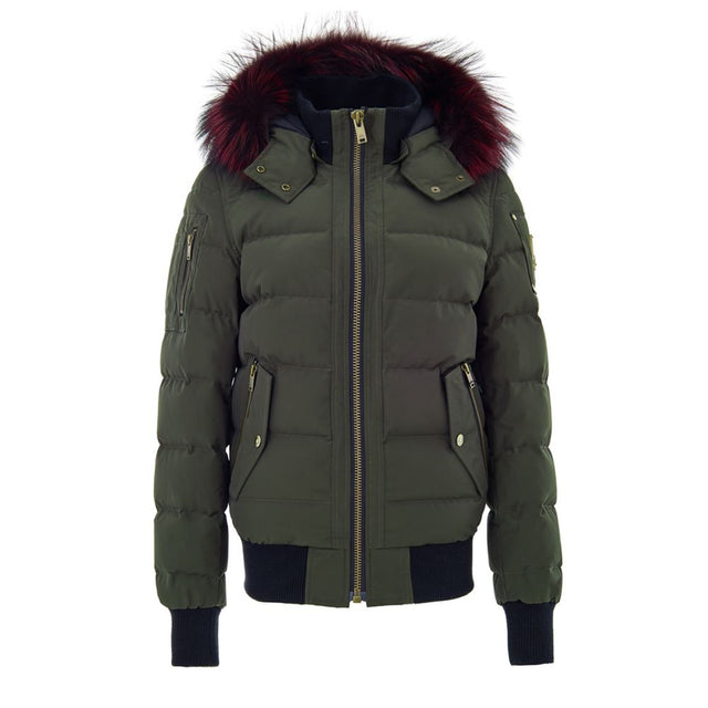 Moose Knuckles Green Bomber Jacket with Hood and Fur. Made from green technical fabric, it features a padded interior, a front zip fastening, a contrasting elastic waistband, two side flap pockets, and a small pocket on the sleeve. Adjustable and removable hood with fur trim, and a logo applique on the sleeve. Composition: 74% Cotton, 26% Nylon. Fox Fur