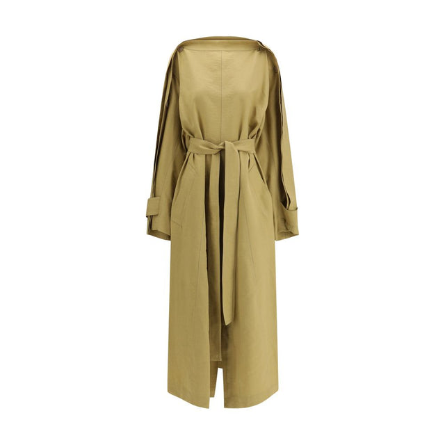 The trench coat Dress by Petra Petrov delivers a modern, structured elegance. Designed with a boat neckline, it features belt loops and a matching belt to define the waist. The design is completed by two front welt pockets and long sleeves finished with an adjustable sleeve tab with a single button—a tailored detail that allows the sleeve to be cinched and shaped, echoing classic trench coat elements. The balanced silhouette makes the piece both versatile and refined.