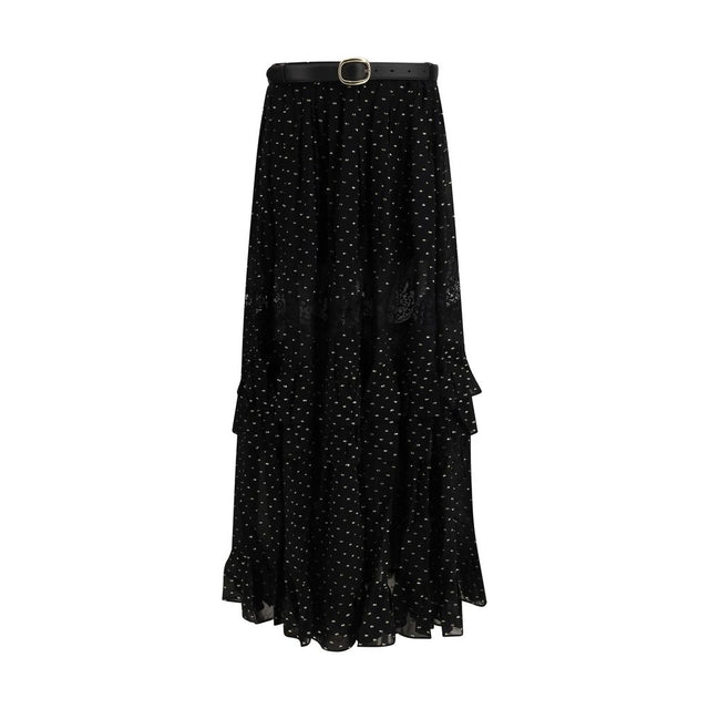 The Chiffon Lace Maxi Skirt by Self Portrait brings boho chic into party-ready territory with a refined, statement-making attitude. Cut from metallic fil coupé chiffon, it plays with sheer textures and shimmering accents that catch the light beautifully. Dramatic ruffles enhance the skirt’s fluid movement, adding depth and allure to the silhouette. An elasticated waistband ensures effortless comfort, while the partial lining maintains a delicate balance between lightness and sensuality. Ideal when styled with the matching top for a striking, coordinated look.