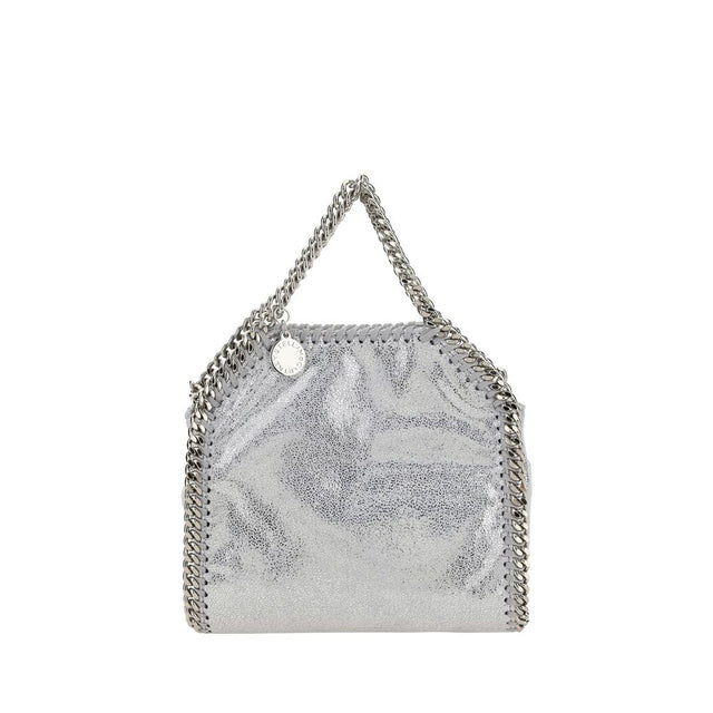 Tiny Shaggy Tote Shoulder Bag by Stella McCartney, the brand’s iconic faux leather design, chain trim on the bag’s trim, chain top handles, interior snap-button closure, single interior compartment, metal pendant attached to the base of the handle with iconic engraved logo.