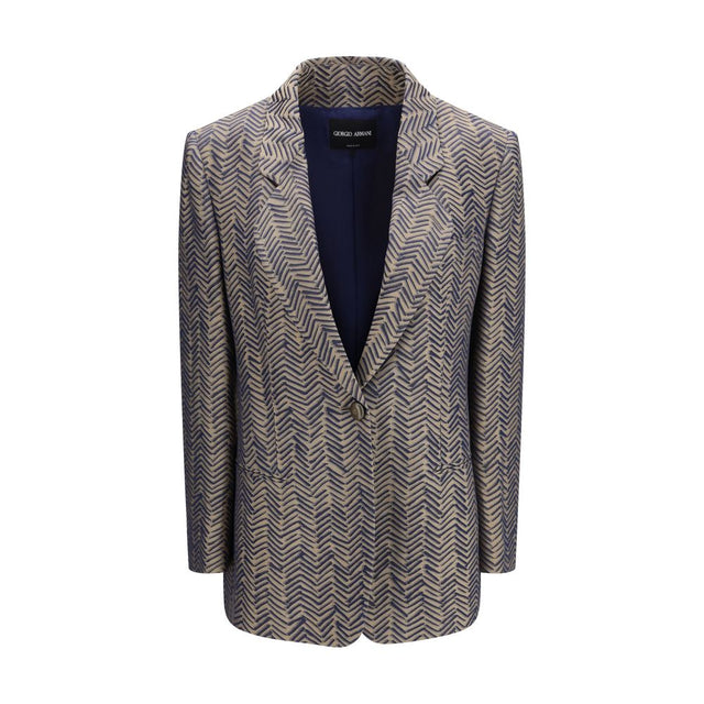 The single-breasted Jacket by Giorgio Armani crafted from chevron jacquard viscose, defined by an elegant and refined silhouette. The design features peak lapels and a single-button front fastening that enhances its clean, tailored aesthetic. A welt chest pocket and two front welt pockets complete the structure with functional and understated details. Partially lined for comfort and lightness, this Made in Italy jacket reflects the house’s signature balance between craftsmanship and contemporary style.