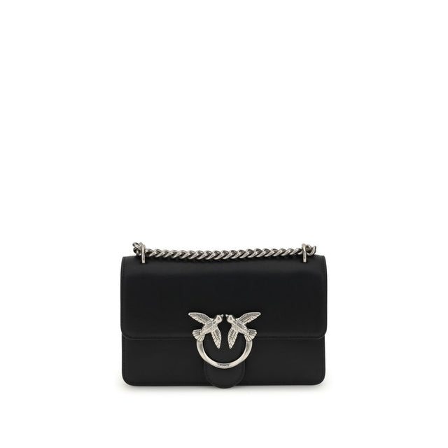 Calfskin Love One Mini Shoulder Bag by Pinko, featuring front flap closure with magnetic button, iconic gold-plated Love Birds logo embossed on front, dual interior compartment, sliding chain strap, iconic tone-on-tone embroidered brand monogram on back, adjustable and removable flat leather shoulder strap.