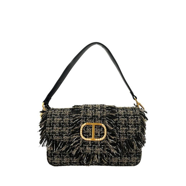 Elevate your accessory game with Twinset’s chic Shoulder Bag, where sophistication meets playful charm. Adorned with eye-catching decorative fringe and pearls-logo embellishment, this bag promises to turn heads. The sleek black hue pairs effortlessly with any ensemble, while the practical magnetic button flap closure unveils a thoughtfully compartmentalized interior, essential for the modern woman on the go. Glistening gold metallic details add a touch of luxury, making this bag a must-have for those who dare to make a statement.